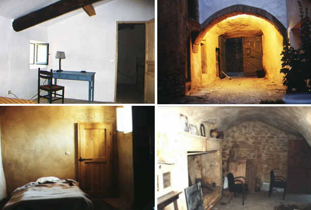 The Photos: 1.) The entry from the street and the stairs leading up from the courtyard to the main entry. 2.) On the left, two views of upstairs bedrooms, the entry at dusk, and the oldest part of the house. 3.) Another bedroom view showing the thickness of the walls and the floor tiles of quarry stone, and the stairs leading to the third floor showing the wear on the stones. 4.) From the upper landing: shutters and the courtyard.