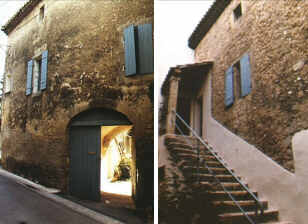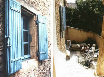 As I sit in the courtyard, behind me and on the fourth side of the courtyard, one enters the street under a stone arch perhaps twenty feet in width and depth. This arch supports the kitchen, and to its right, another arch supports the second-floor bathroom. This room is to the right of the kitchen as one enters the house at the top of the stairs. To the left of the entry arch, two small openings lead into storage areas. And to the right, a recessed area below the top of the stairs opens into another room with an arched ceiling, also unfinished and being used for storage. An ideal spot for a hot tub, says Martin, but Pierre would prefer a sauna. To the right is a shuttered window which conceals a well. Pierre thinks it would be best to seal off the well, as some claim that wells like this one keep the house damp. In fact, just above this area, Pierre had found a poorly capped water pipe in the kitchen which had been leaking for many years. The visibly wet stones were only slowly relinquishing their stored moisture, even in the heat of June in Provence.
